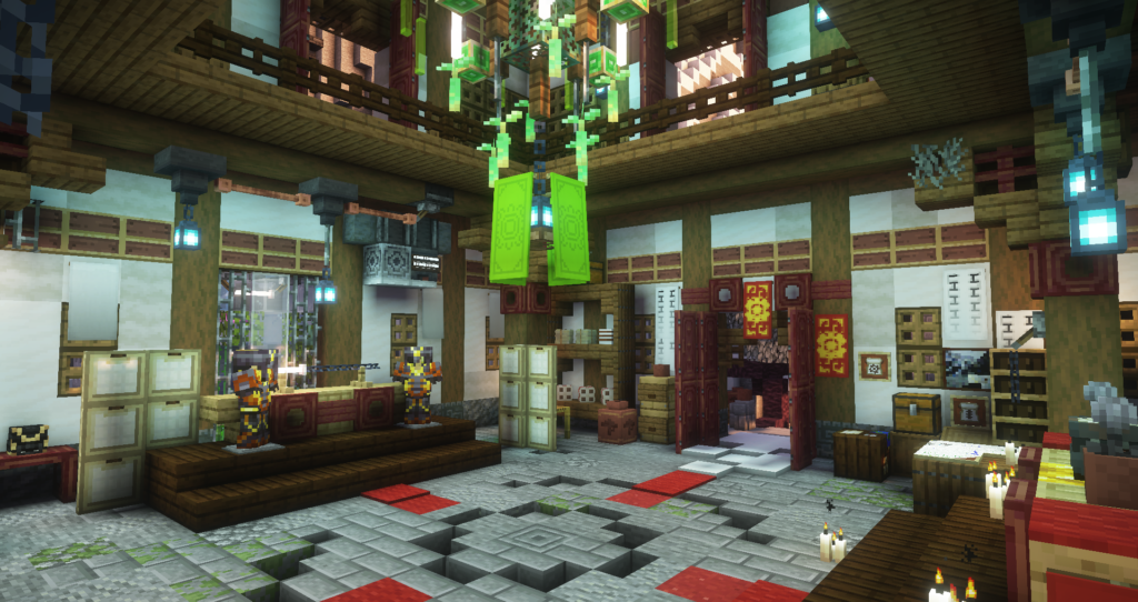 – The great master’s tea room, which provides a contrasting, cozy vibe, full of tapestries and relics. The room is part of the balcony platform, but is enclosed with shoji doors, allowing for the glow sunset light to filter into the interior difusely.